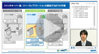 14分 | スイッチオーバー/スイッチバックを行い、その際のマスタ/レプリカサーバの動きも確認します。この章では特にArcserve High Availabilityの運用の流れをご理解いただきます。 |